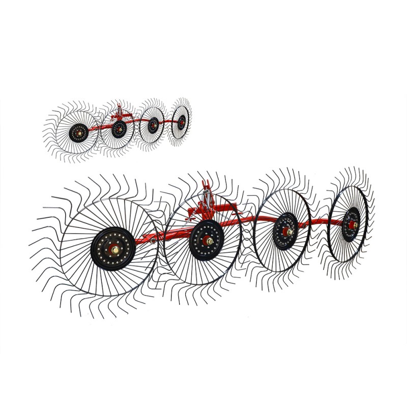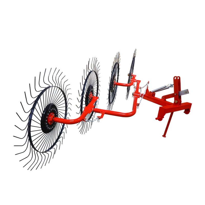 Le râteau agricole est une machinerie de récolte d'herbe qui rassemble de l'herbe éparpillée sur le sol dans les lanières de gazon. Cette machine convient pour accrocher le dispositif de suspension à trois points d'un tracteur à roues. La partie de travail est un disque de doigt avec des dents captivantes, et la machine est transmise séquentiellement au disque du doigt suivant par le disque du doigt jusqu'à ce qu'une bande d'herbe lâche et ventilée se forme. La modification de l'angle du cadran peut ajuster la largeur de la bande d'herbe. Les dents sont de longues dents en acier de printemps, qui ont un bon effet de peignage et de fortes performances d'imitation. Les dents forment une configuration radiale sur le moyeu de roue, qui peut éliminer l'influence du vent et faciliter le passage de la poussière. À l'aide d'un ressort de tension pour contrôler la pression du disque du doigt sur le sol, la pression d'atterrissage peut être ajustée en étirant la plaque de réglage en fonction des conditions de récolte et de sol. Le Râteau à la ferme a une structure simple, un fonctionnement facile, une utilisation fiable, quelques défauts, une grande efficacité et une bonne qualité de travail. Maintenance facile et bonnes performances de correspondance d'énergie.